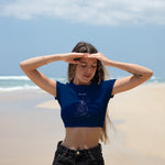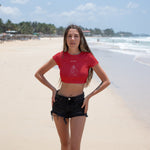 Ön kısmında yer alan dikkat çekici baskılı tasarımı, crop t-shirt’e dinamik ve modern bir görünüm kazandırır. Crop kesimiyle yüksek bel pantolon, şort veya eteklerle kolayca kombinlenerek tarzınızı ön plana çıkarır.