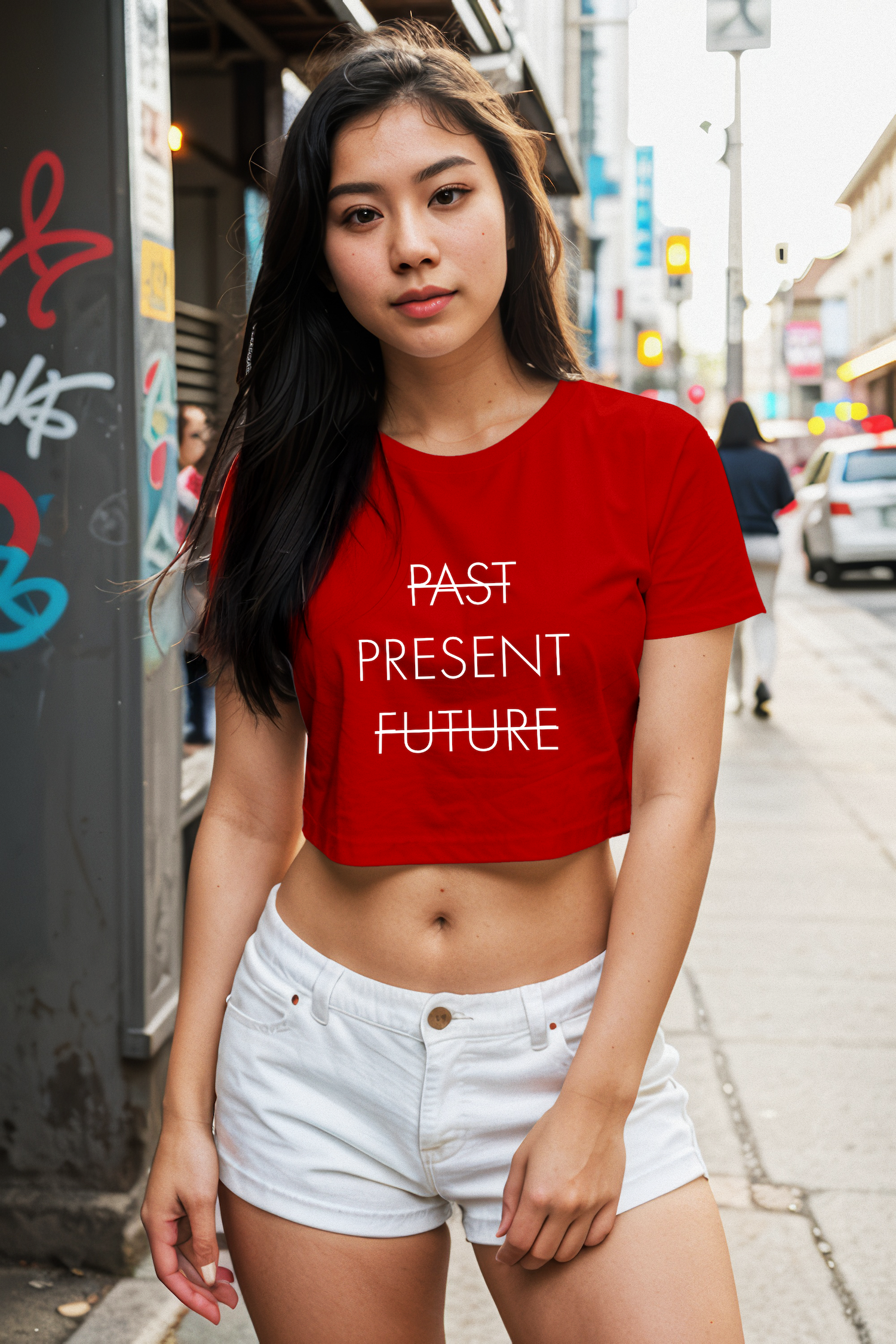 Ön kısmında yer alan dikkat çekici baskılı tasarımı, crop t-shirt’e dinamik ve modern bir görünüm kazandırır. Crop kesimiyle yüksek bel pantolon, şort veya eteklerle kolayca kombinlenerek tarzınızı ön plana çıkarır.