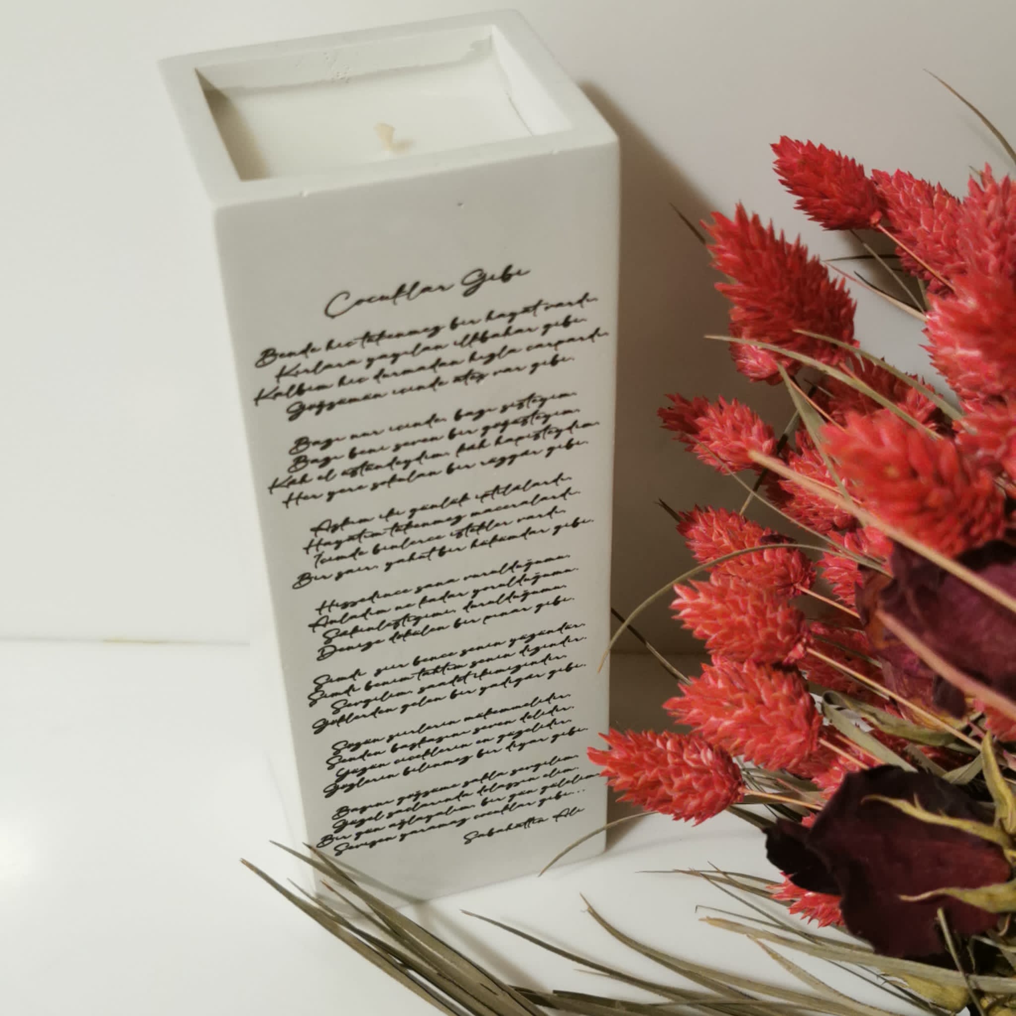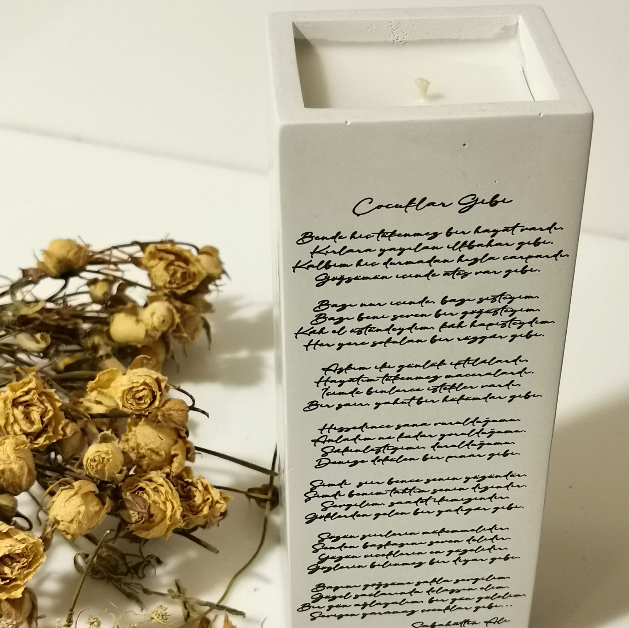 Türk edebiyatının en önemli figürlerindendir Sabahattin Ali. Edebî kişiliği ile pek çok türde eser bırakmıştır. Sabahattin Ali öykü türünde ve Kürk Mantolu Madonna gibi romanlarıyla öne çıksada şiirler dahil birçok edebi metin ortaya koymuştur. Bu eserlerden günümüzde en çok bilinenlerden biriside ve aynı zamanda Sezen Aksu'nun şarkı olarak bestelediği Çocuklar Gibi şiiridir. Çocuklar Gibi şiirini dilediğiniz alanda sergileyebilmeniz için beton mum olarak hazırladık. Bu muhteşem ürünü kuru çiçekler ile beton vazo örtüyü olarak kullanabilirsiniz.