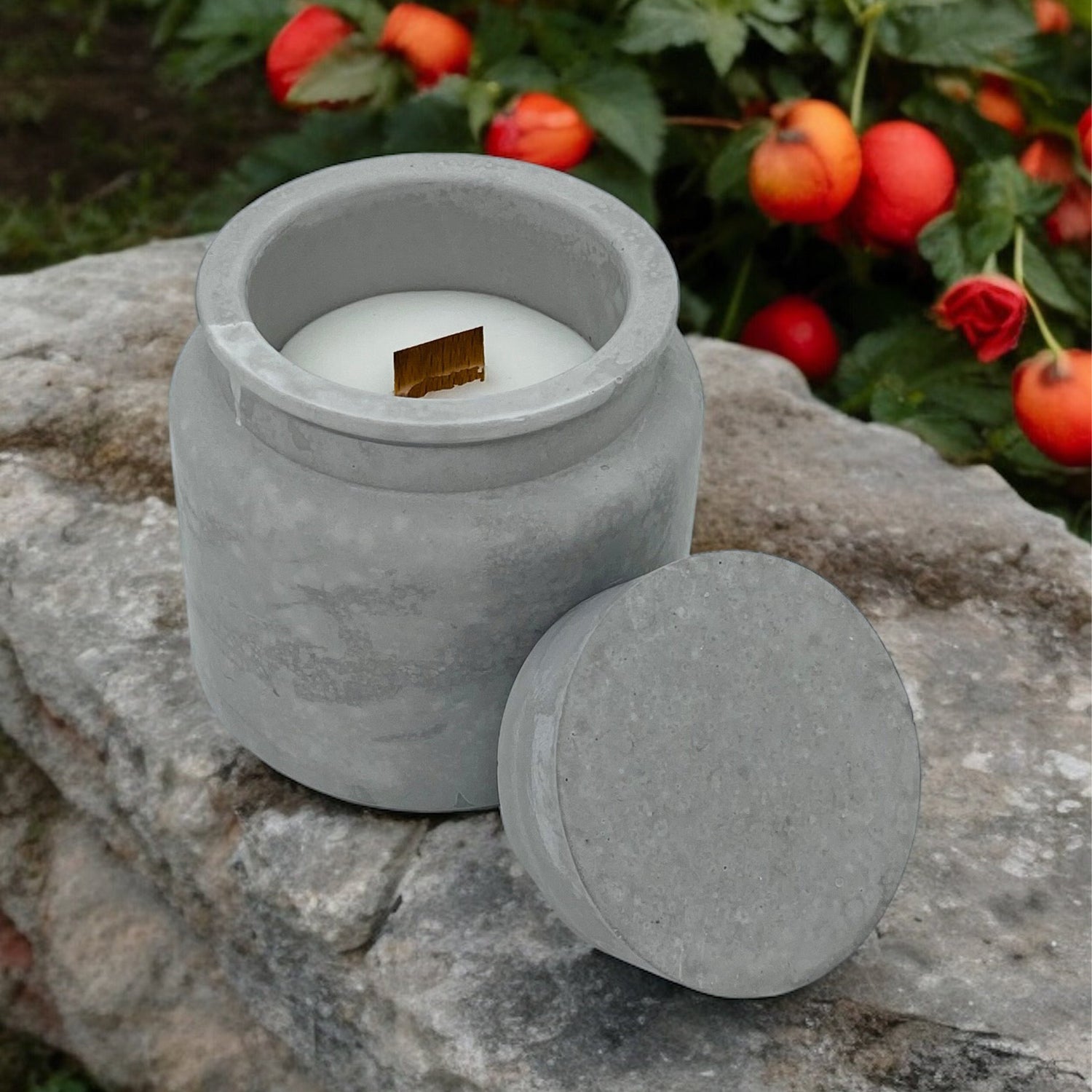 1 adet sandal ağacı - vanilya kokulu ahşap fitilli kapaklı kavanoz beton mum