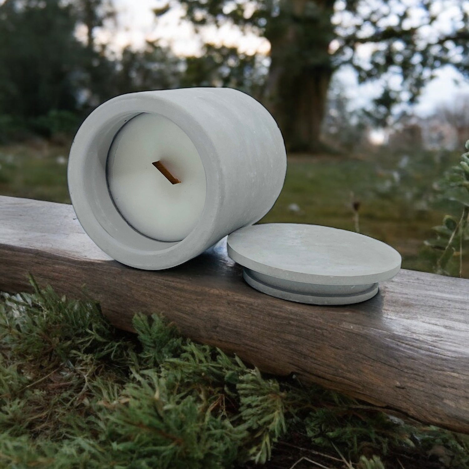 1 adet sandal ağacı - vanilya kokulu ahşap fitilli kapaklı silindir beton mum