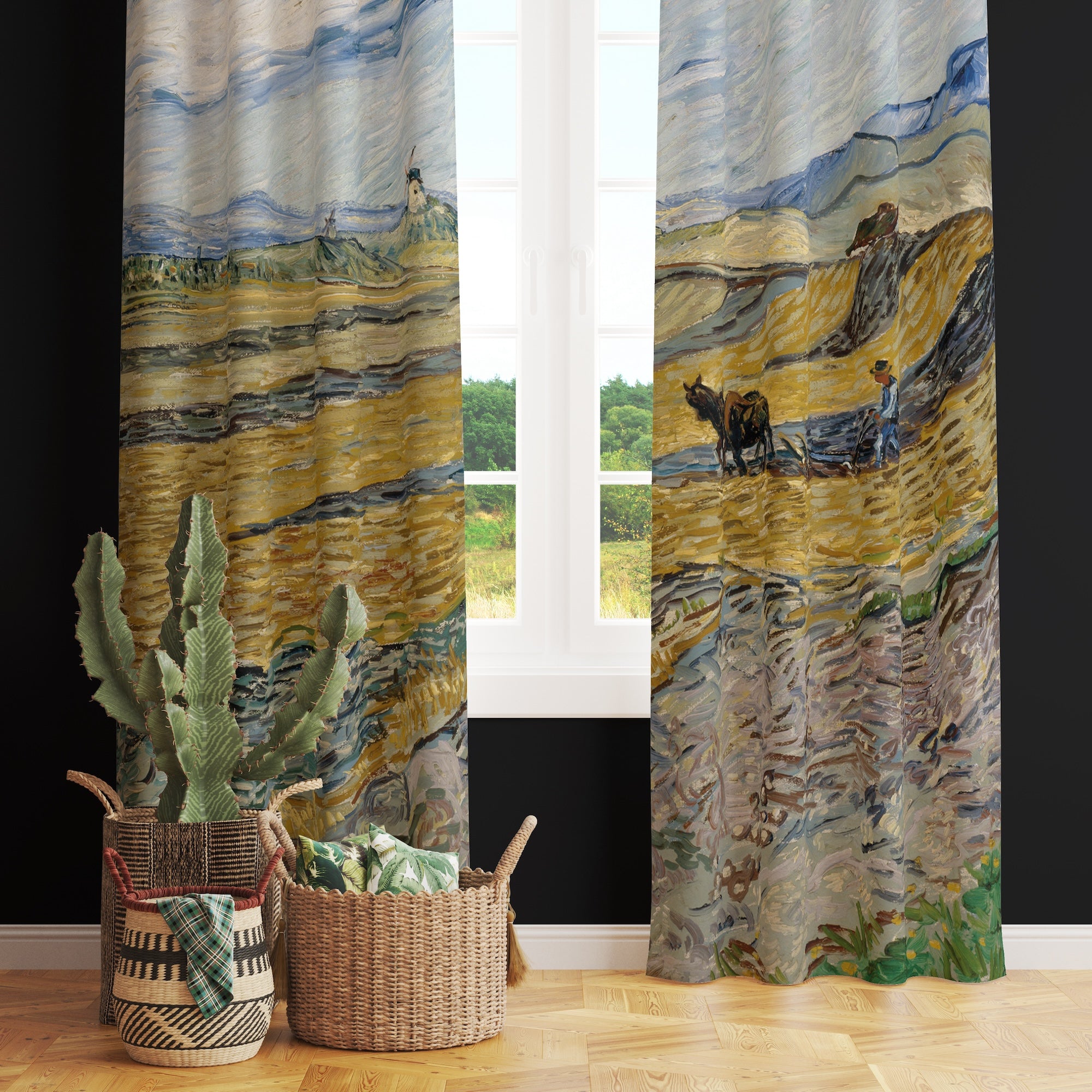 Sabanla Çift Süren Köylü ve Yel Değirmeni Tarlası Fon Perde